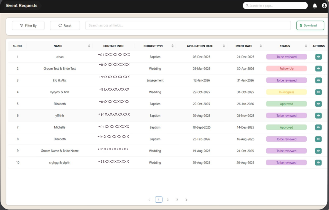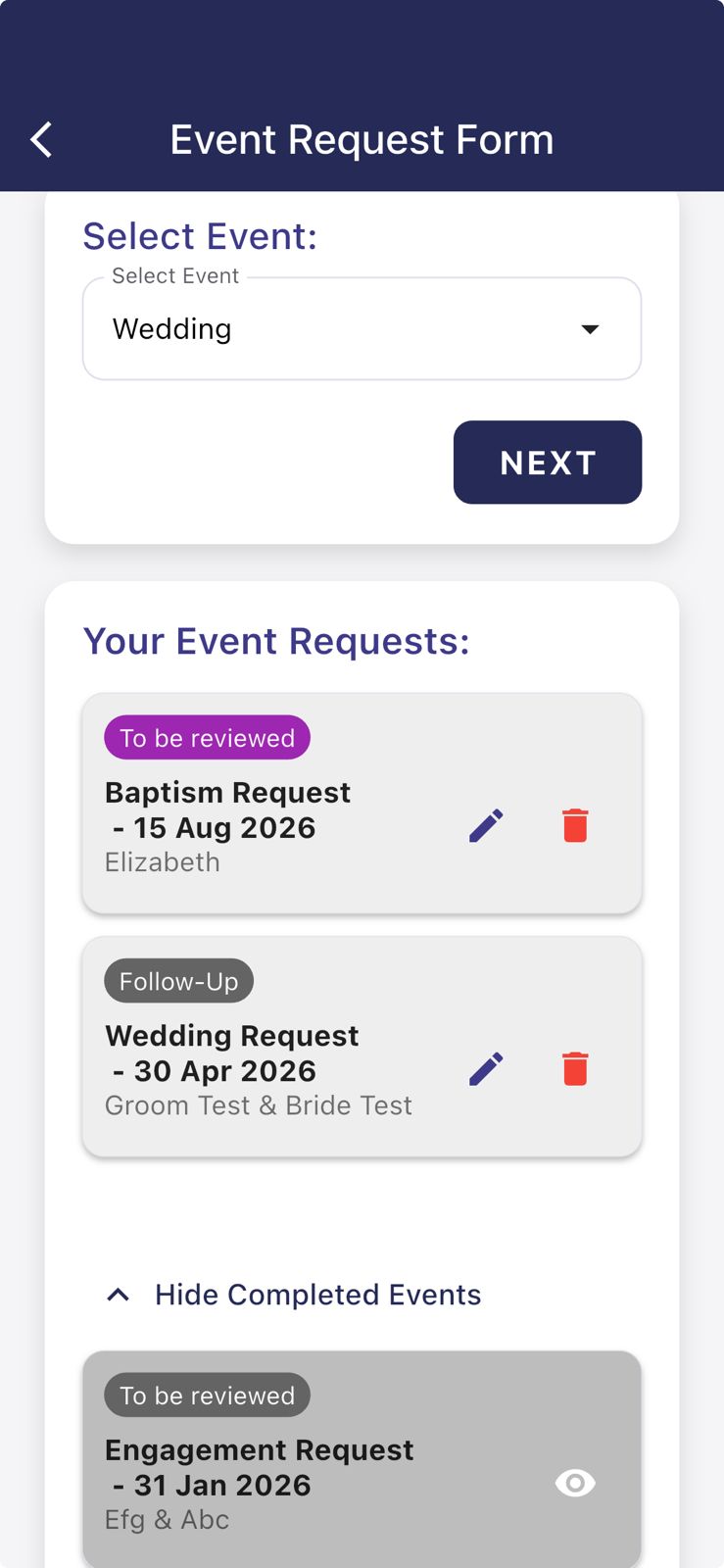 • Event Requests: Request weddings, baptisms, child dedications, engagements