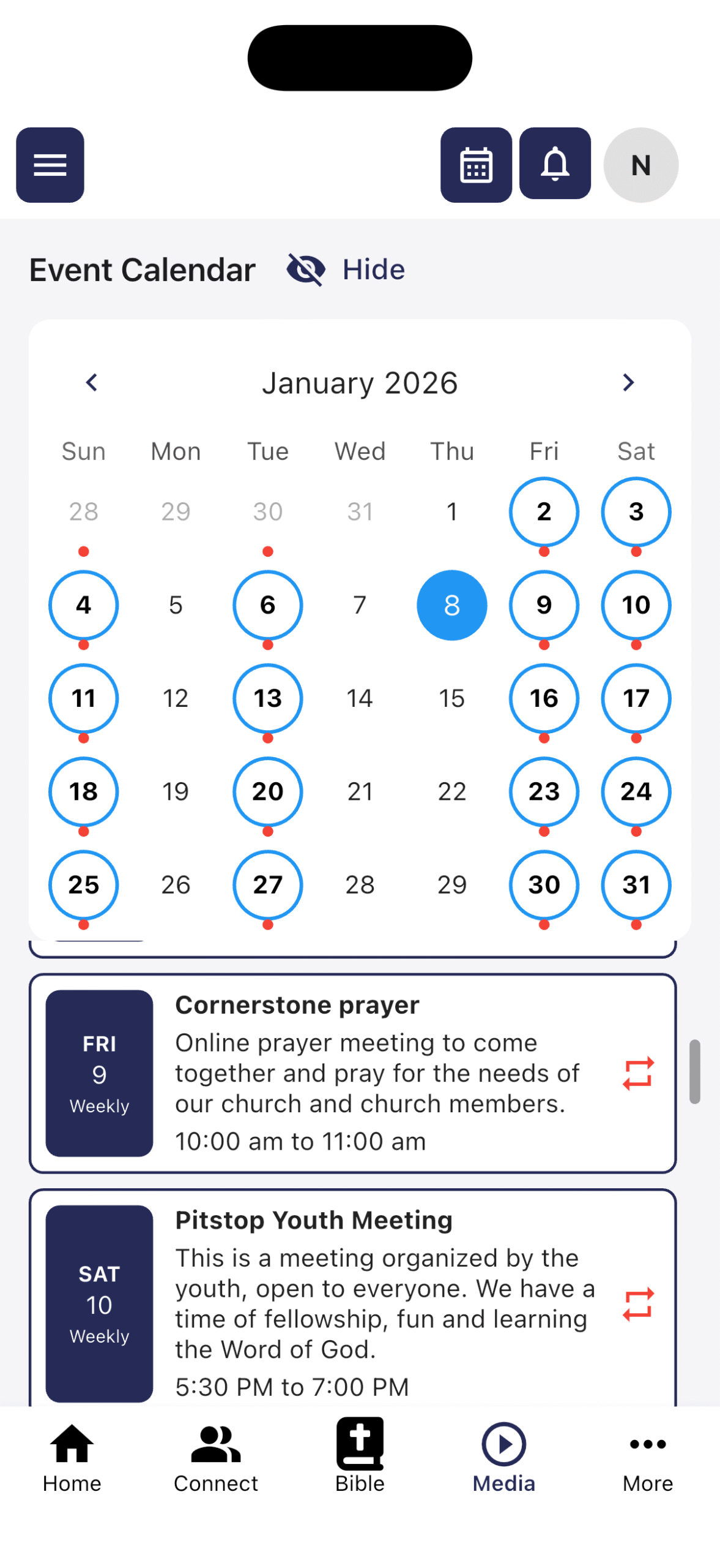 • View upcoming church events