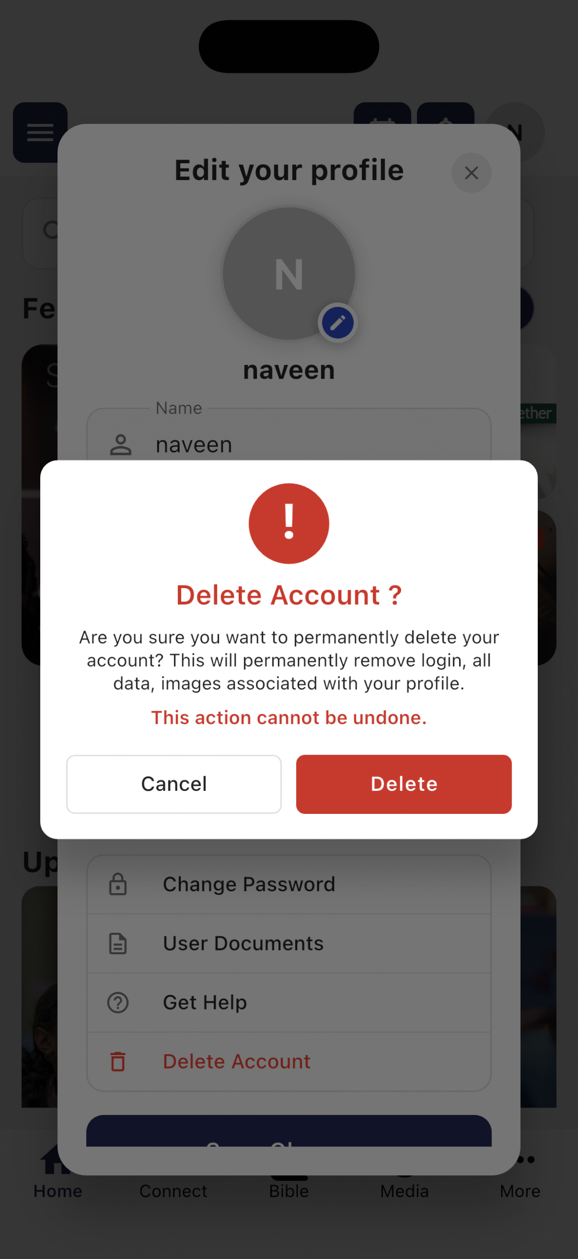 →    OR  Tap  Delete Account  —  red button — permanently deletes your account